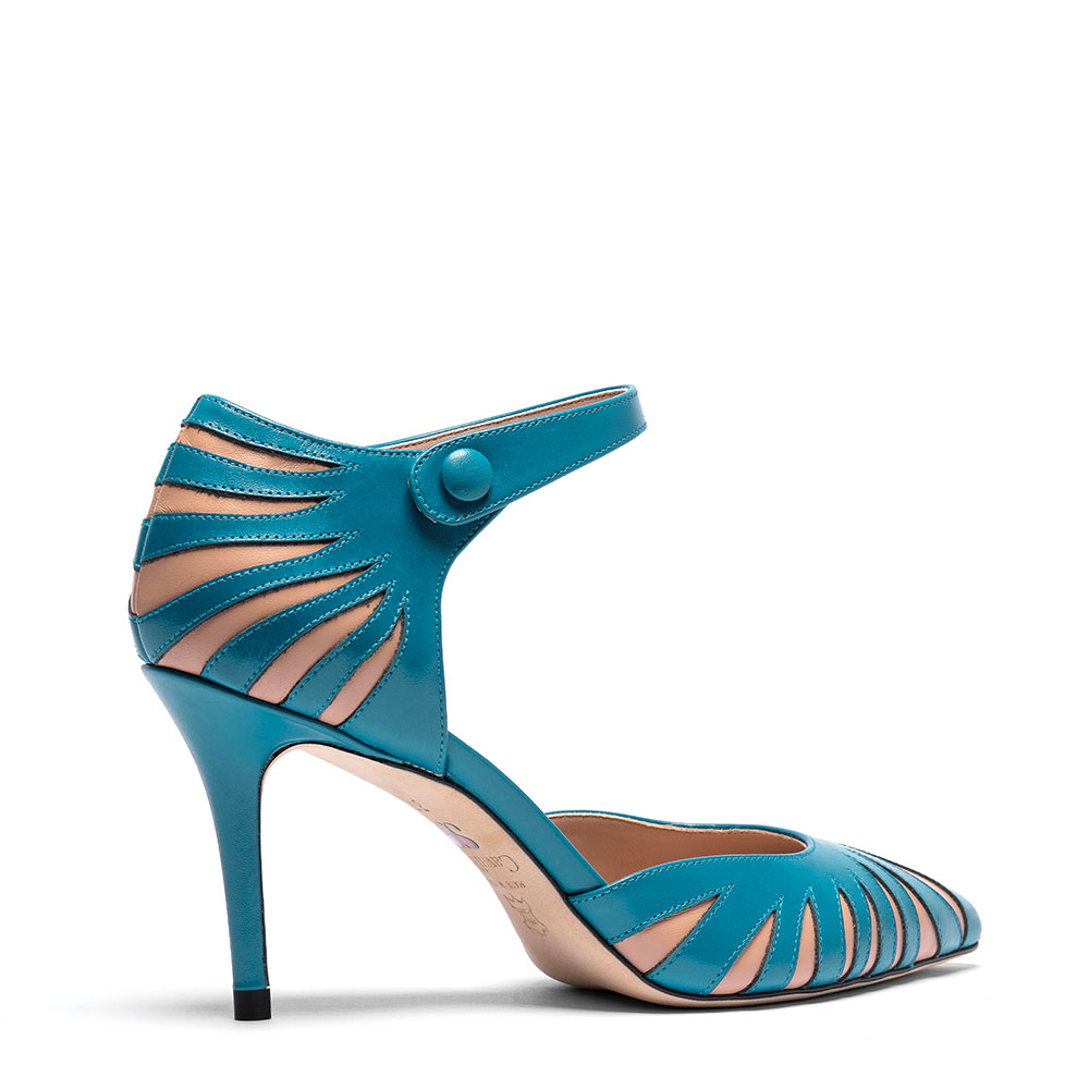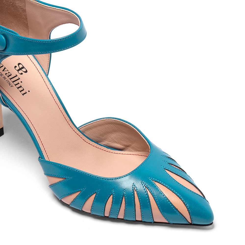 Décolleté in vera pelle di vitello con tacco da 8,5 cm e allacciatura con bottone