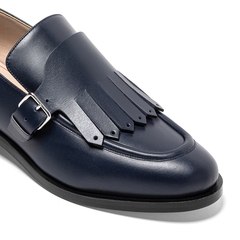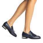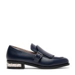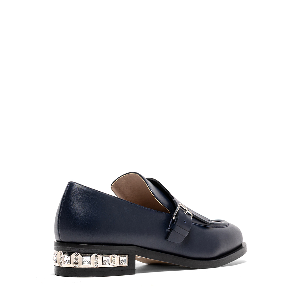 Mocassini blu in vera pelle di vitello con tacco da 3,5 cm rivestito in veri Swarovski