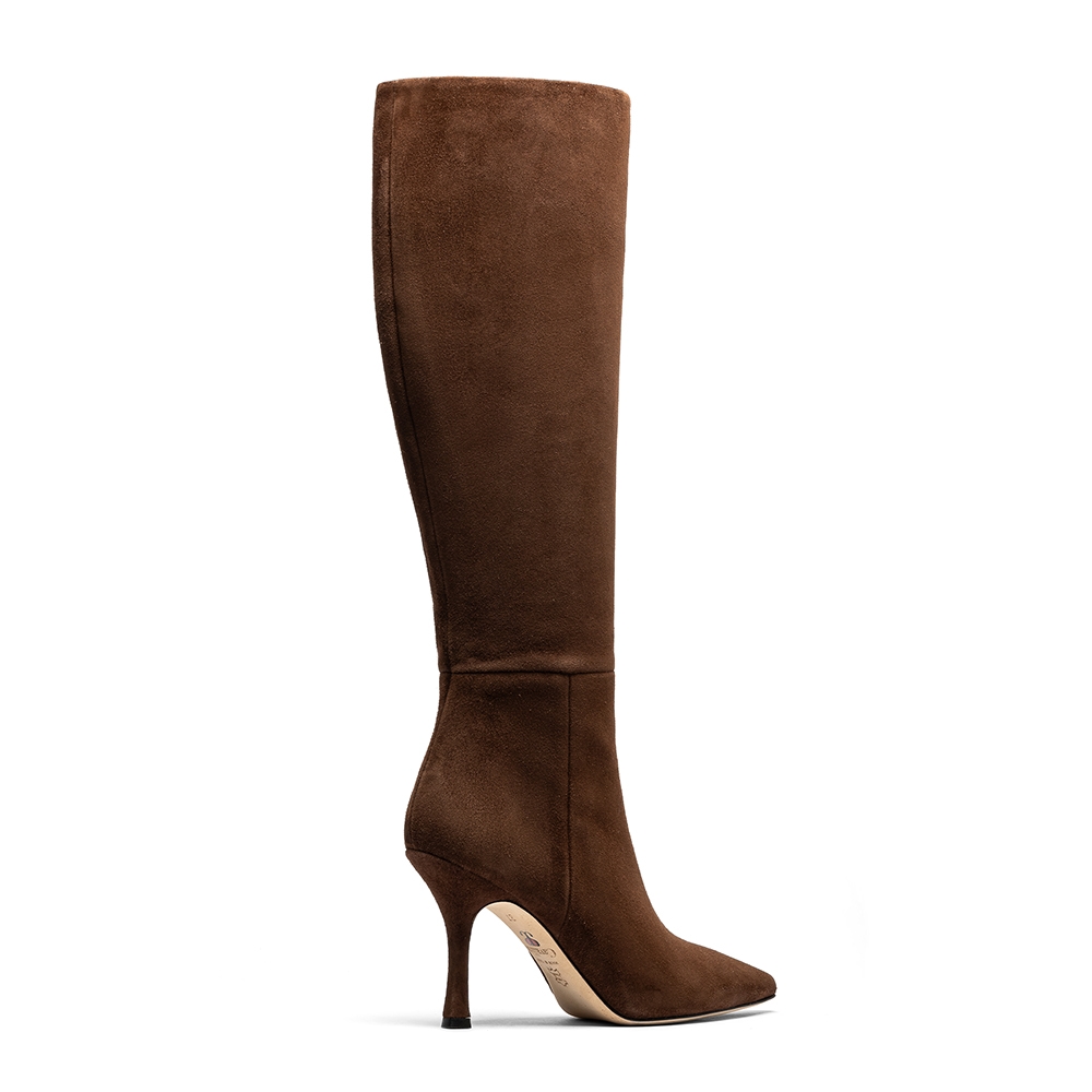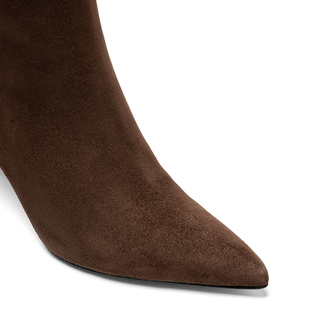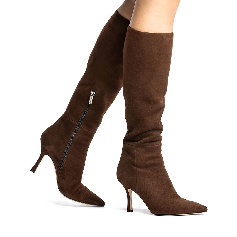 Stivali marroni scamosciati con tacco da 8,5 cm e cerniera interna