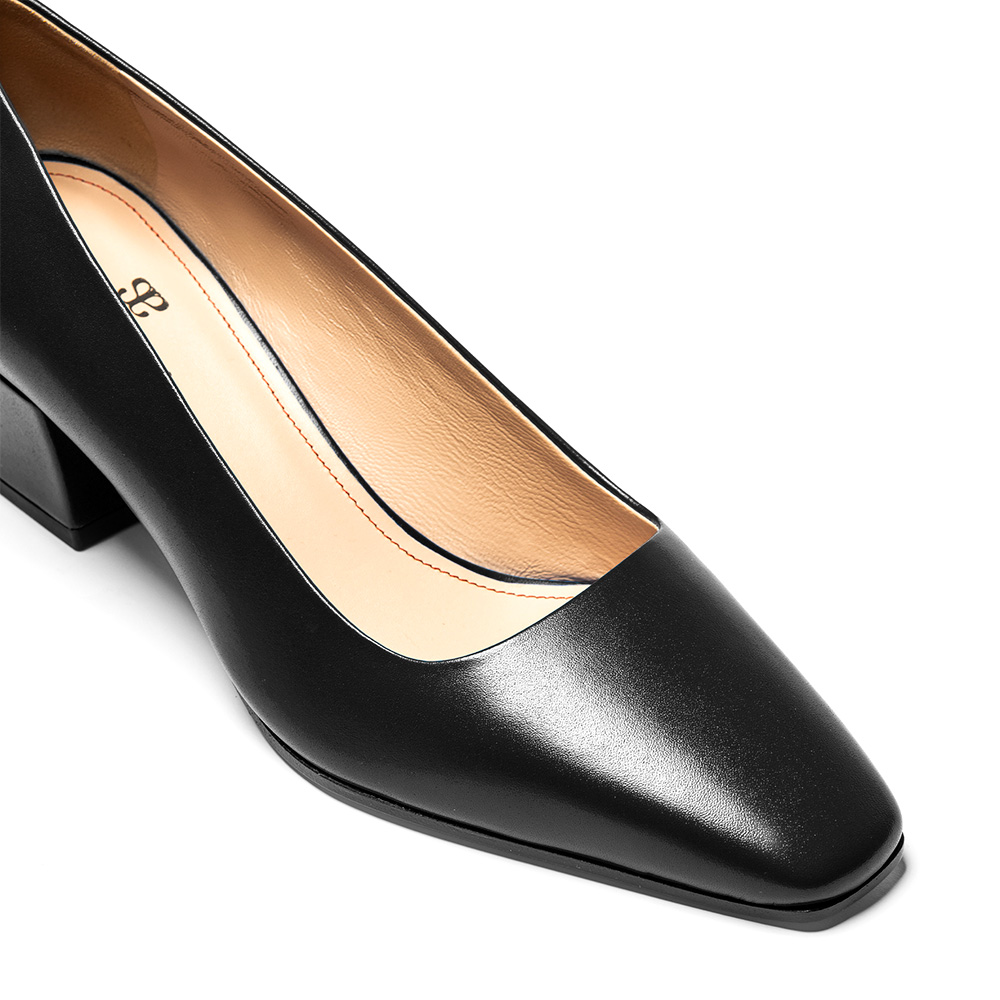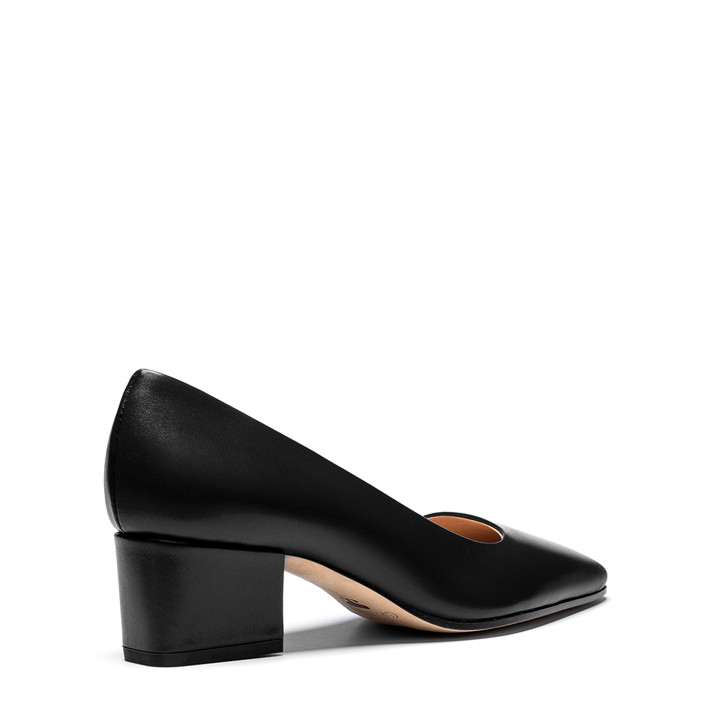 Comoda décolleté in vera pelle di vitello con tacco largo da 4,5 cm ed effetto antiscivolo grazie alla suola in cuoio pomiciato.
